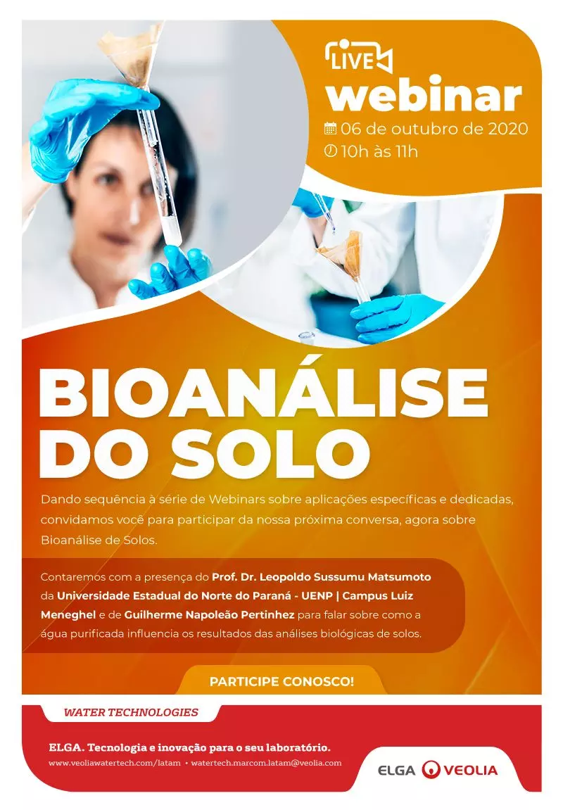 The next webinar focused on Soil Bioanalysis will take place on October 6th - at 10am. The speakers will be Prof. Dr. Leopoldo Sussumu Matsumoto of the State University of Northern Paraná - UENP | Campus Luiz Meneghel and by our Expert Guilherme Napoleão Pertinhez of ELGA VEOLIA.