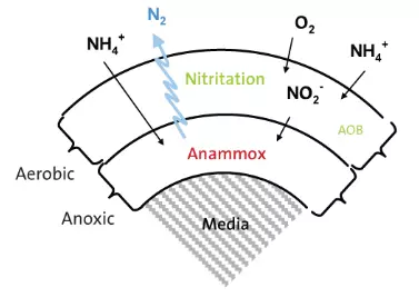 An anammox process takes place in two steps: aerobic nitritation by ammonia oxidizing bacteria and anoxic ammonia oxidation performed by anammox bacteria. In Anita Mox, the two steps take place simultaneously in a single reactor.