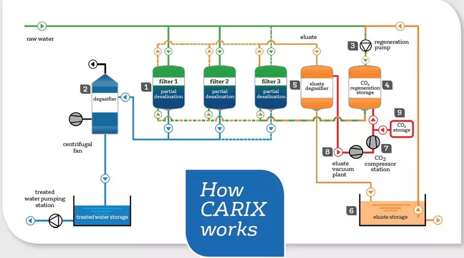The Carix™ ion exchange process (CArbon Dioxide Regenerated Ion EXchanger) allows for a purposeful partial desalination and therefore softening of drinking water containing high amounts of hardeners, nitrate and sulfate.