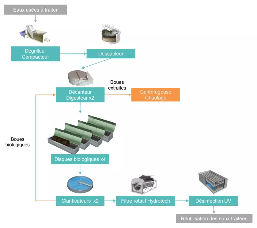 - Traitement tertiaire par filtration Hydrotech et UV : permet la réutilisation de l’eau pour l’arrosage des espaces verts du complexe touristique et le rejet en mer (préservation de la zone de baignade).
