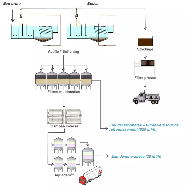 Veolia Water STI (Solutions & Technologies pour l'Industrie) a été retenue pour la réalisation de l’unité « clé en main » de production d’eau de process de la centrale thermique (études, conception, fabrication, montage et mise en service).