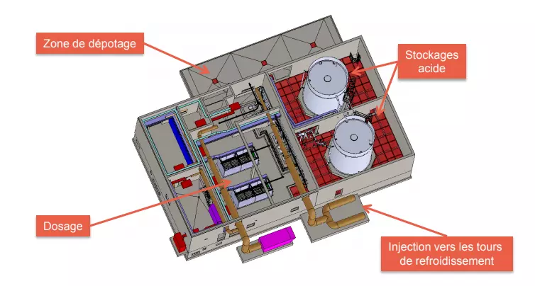 - Système CTF : mise en place de deux installations d’injection d’acide sulfurique automatiques en remplacement du traitement initial à l’acide chlorhydrique et analyse en continu des paramètres chimiques.
