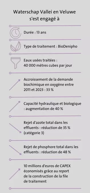 La station d'épuration (STEP) d'Ede aux Pays-Bas, exploitée par Waterschap Vallei en Veluwe, dessert 300 000 équivalents-habitants. Confrontée à un accroissement de la charge à traiter et prévoyant une augmentation de 20 %, la station avait du mal à respecter les normes de rejets européennes.
