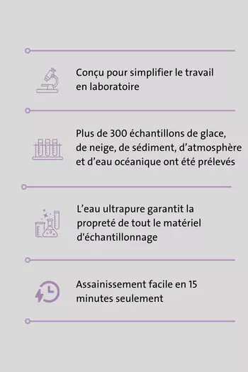 Le laboratoire du navire était équipé d’unités Purelab® Flex 3, qui se sont révélées indispensables pour préserver l’intégrité des échantillons dans des conditions extrêmes. Ces technologies ont permis de prélever et d’analyser, sans contamination, plus de 300 échantillons de glace, de neige, de sédiment, d'atmosphère et d’eau océanique.