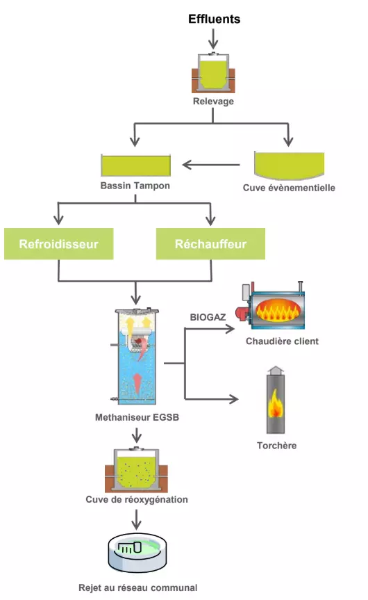 - Valoriser les effluents en les transformant en biogaz pour les besoins de l’usine du client (chaleur utilisée dans les process de fabrication de sirops).