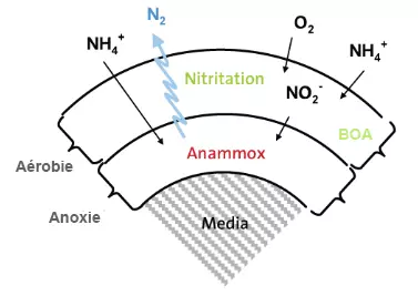 Un procédé anammox comporte deux étapes : nitritation aérobie par des bactéries oxydant l'ammoniaque (BOA), et oxydation anoxique de l'ammoniaque par des bactéries anammox. Dans Anita Mox, les deux étapes se déroulent simultanément dans un seul réacteur.