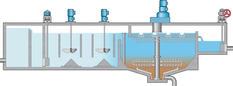 L'eau entre ensuite dans la zone de décantation lamellaire où la gravité sépare les flocs de l'eau clarifiée. Les flocs décantent au fond de cette zone de clarification et sont éliminés sous forme de boue liquide, tandis que l'eau clarifiée est débarrassée de la plupart des impuretés (matières organiques, métaux, huiles et graisses sont éliminés par gravité).