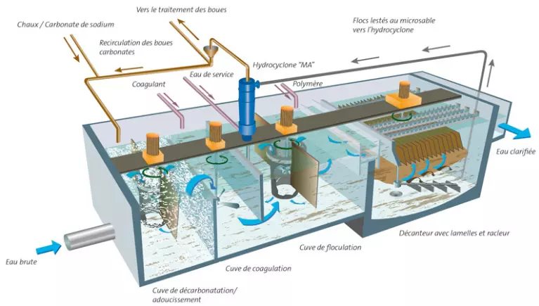 - Décarbonatation et adoucissement des eaux de surface ou de forage pour la production d'eau potable