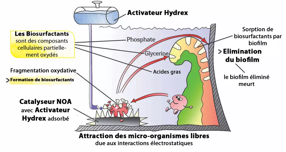 Les catalyseurs haute performance BerkeLYT attirent les fragments des micro-organismes - tels que les bactéries, les levures ou les moisissures - présents dans les circuits d’eau, par charge électrostatique. Ces fragments de germe sont dégradés à la surface du catalyseur. Des biosurfactants sont produits grâce à ce procédé. Ces biosurfactants provoquent l’élimination et la mort du biofilm présent dans les matériaux de surface et empêchent également son développement, ce qui réduit donc le risque de légionellose.