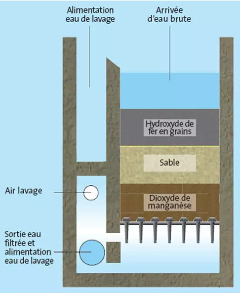 Mangaflo™ Plus repose sur le même principe de base avec l'ajout indispensable d'une couche d'oxyde de fer qui permet de traiter l'arsenic. Ce matériau agit comme un adsorbant. Selon la capacité de traitement de l'installation, la filtration s'effectue au moyen d'un filtre ouvert ou sous pression.