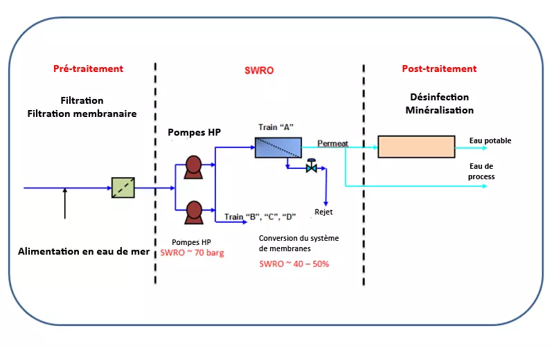La compacité des unités de dessalement de l'eau de mer par osmose inverse et leur flexibilité en terme de pureté de l'eau produite, permettent leur installation sur un site offshore et leur utilisation à la fois pour la production d'eau potable et pour les applications d'eau de process, avec ou sans post-traitement mineur.